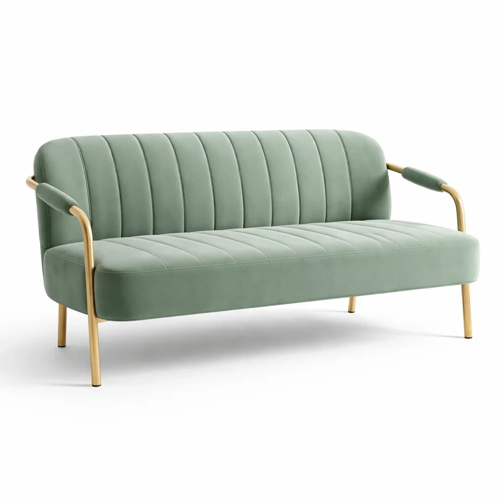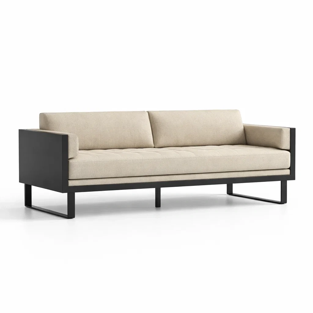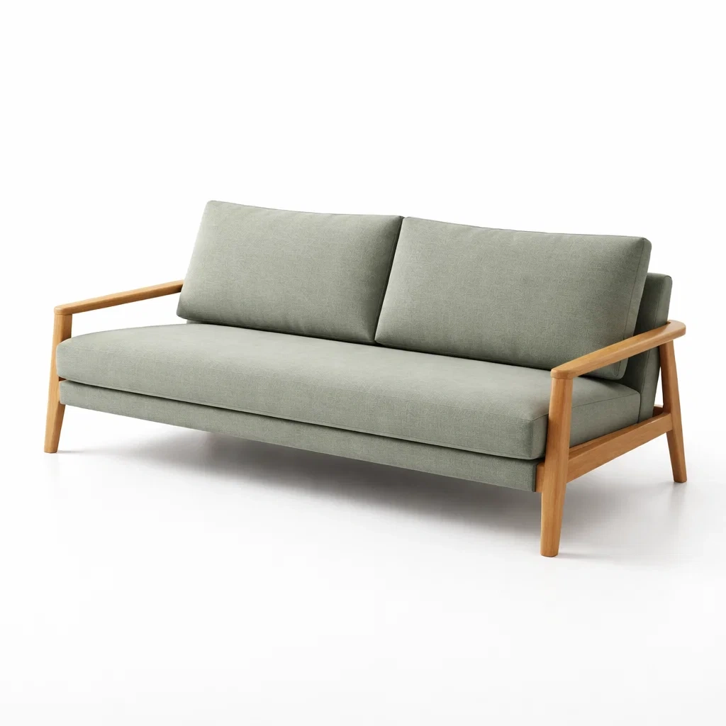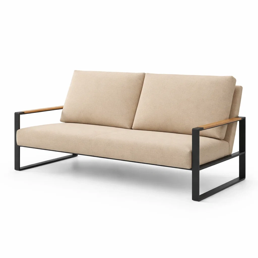 Divano in Tessuto e Metallo con Braccioli in Legno