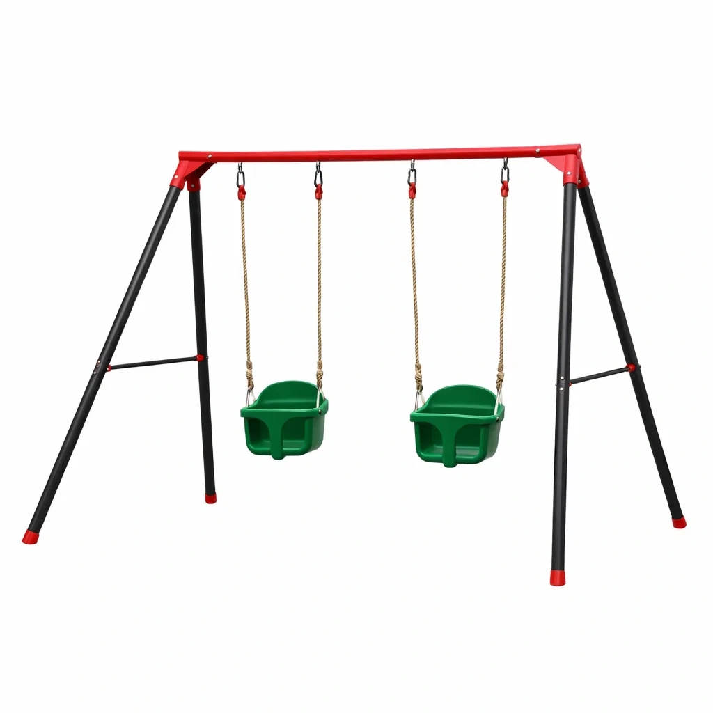 Questa altalena doppia ha una struttura in acciaio verniciato e sedili in polietilene. Le dimensioni sono 220x140x120 cm e il peso complessivo è di 18 kg. La struttura è progettata per uso esterno e deve essere installata su un terreno piano. Per la sicurezza, la struttura deve essere saldamente fissata e l'altalena deve essere utilizzata sotto supervisione di un adulto. È adatta per bambini dai 3 agli 8 anni. Il prodotto è conforme alla norma EN 71 per la sicurezza dei giocattoli e resiste agli agenti atmosferici.