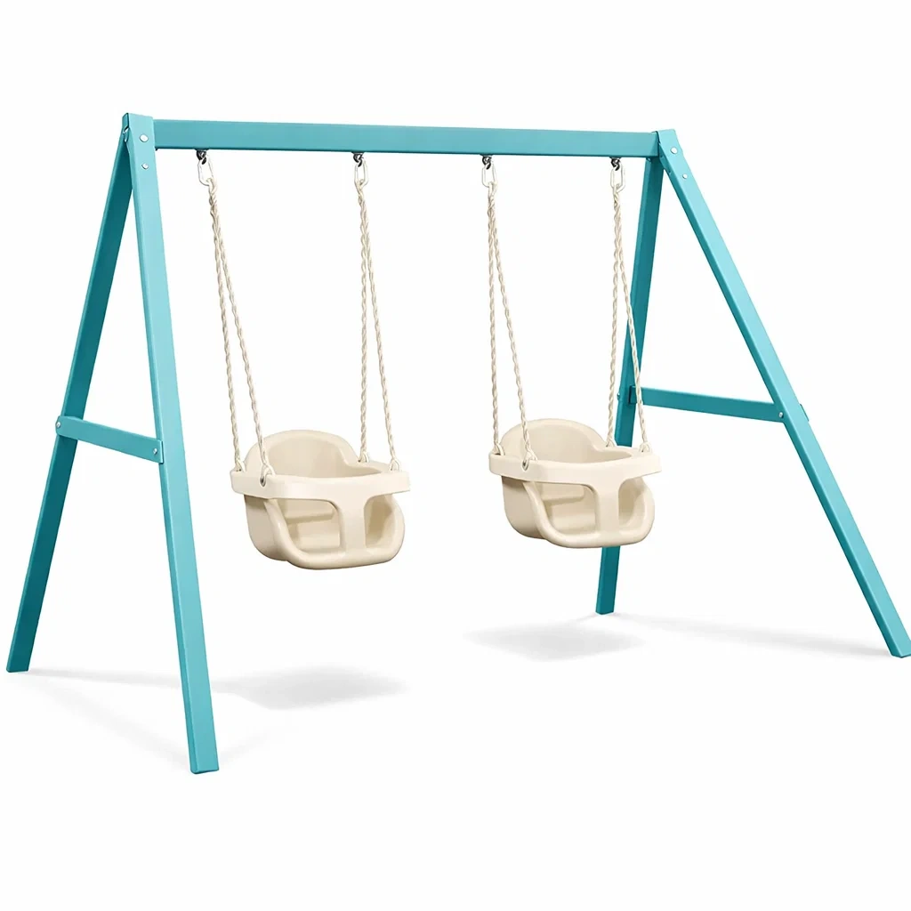 Altalena doppia con struttura in metallo verniciato blu e sedili in plastica polipropilene beige. La struttura è in acciaio e i sedili supportano fino a 30 kg ciascuno.