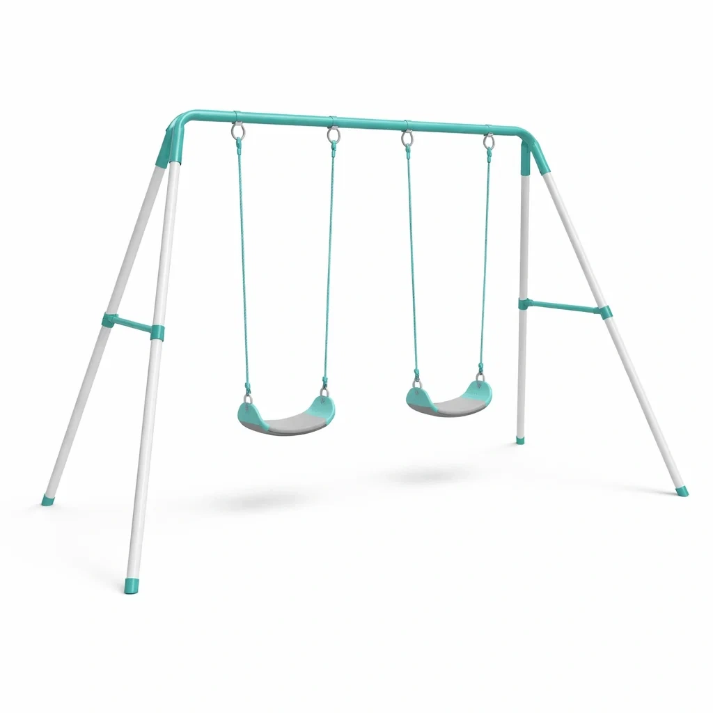 Altalena doppia per esterni, progettata per bambini. Struttura in acciaio con sedili in polietilene e corde in poliestere. Dimensioni complessive: Altezza 180 cm, Larghezza 215 cm, Profondità 160 cm. Età consigliata: 3-10 anni. Conforme alla norma EN 71 per la sicurezza dei giocattoli.